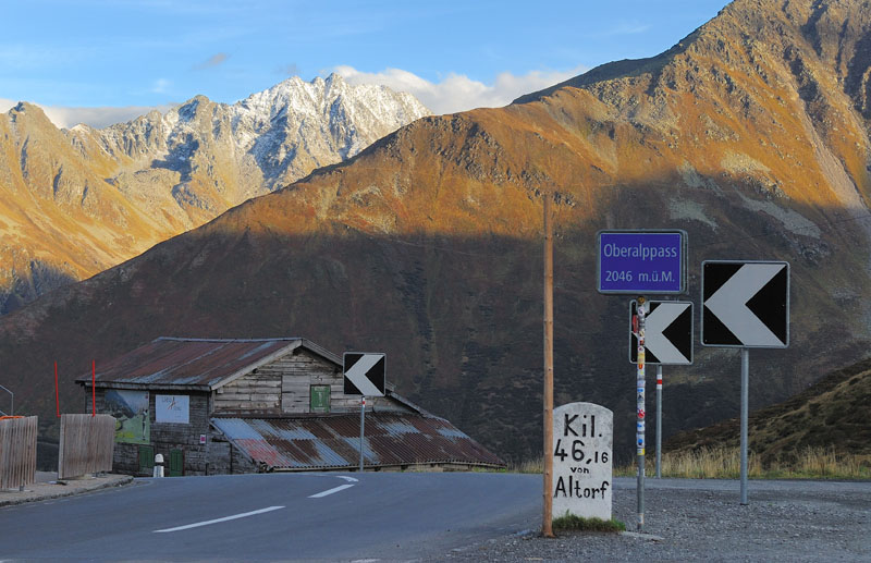 It bypasses Italy from the north by the St Bernard Pass (2065 m, not to be confused with others), to descend in Ticino and back to the famous Gotthard Pass (2108 m). Caution the road is paved on one side and can be slippery.